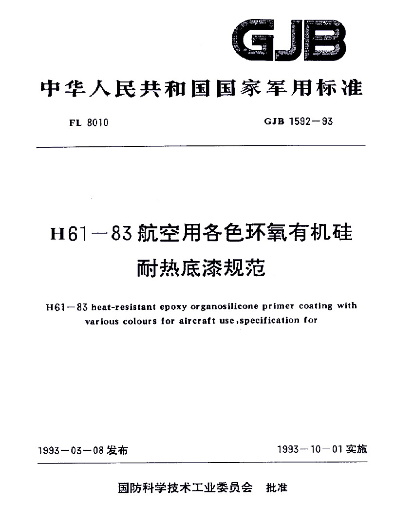 H61-83航空用各色環氧有機硅耐熱底漆規范標準GJB 1592-93 GJB 中華人民共和國國家軍用標準 FL8010 GJB 1592-93 H61-83航空用各色環氧有機硅耐熱底漆規范 H61-83 Heat-resistant epoxy organosilicnne primer with coating with various colours for aircraft use,sp