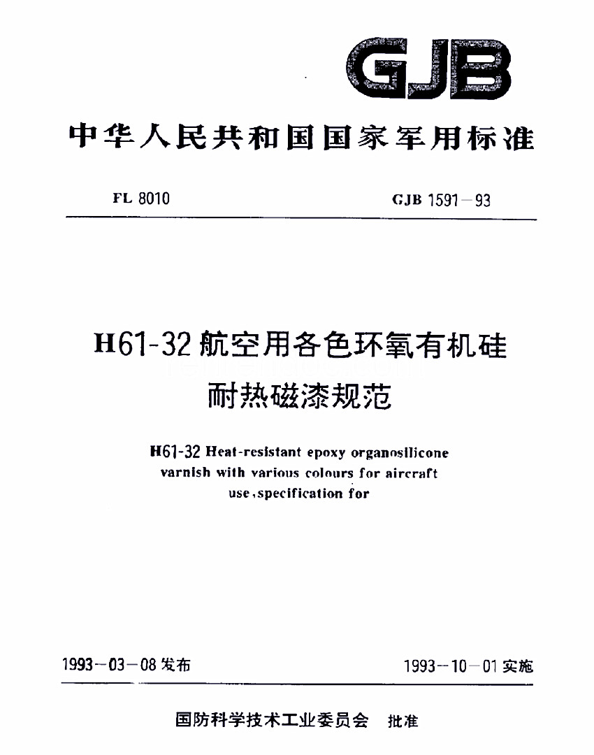H61-32各色環氧有機硅耐熱磁漆標準GJB 1531- 93 GJB 中華人民共和國國家軍用標準 FL8010 GJB 1531- 93 H61- 32航空用各色環氧有機硅耐熱磁漆規范 H61-32 Heat-resistant epoxy organosilicnne vrnish with various colonrs fnraircrufl use speciflc