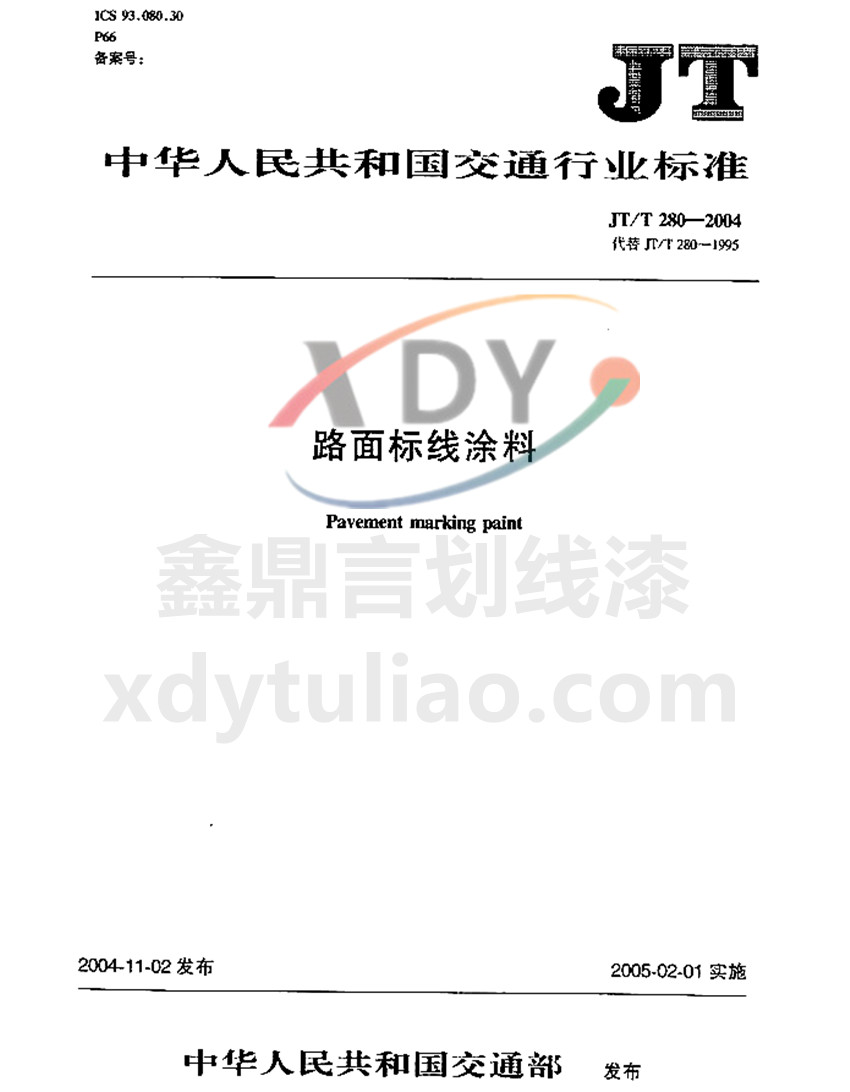 JT/T 280-2004路面標線涂料標準是防腐涂料小編照搬JT/T 280-2004《路面標線涂料》紙質版內容,大家可以放心參考。更多防腐涂料執(zhí)行國家和行業(yè)標準等防腐涂料相關信息可以參考官網:m.cead.org.cn ICS 93.080.30 P66 JT 中華人民共和國交通運輸行業(yè)標準 JT/T 280-2004路面標線涂料Pavement